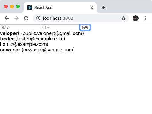 13. 배열에 항목 추가하기 이 섹션에서 사용된 코드는 다음 페이지에서 확인 할 수 있습니다. 이번에는 배열에 새로운 항목을 추가하는 방법을 알아보겠습니다. 우선, input 두개와 button 하나로 이루어진 CreateUser.js 라는 컴포넌트를 src 디렉터리에 만들어봅시다. CreateUser.js import React from 'react'; function CreateUser({ username, email, onChange, onCreat